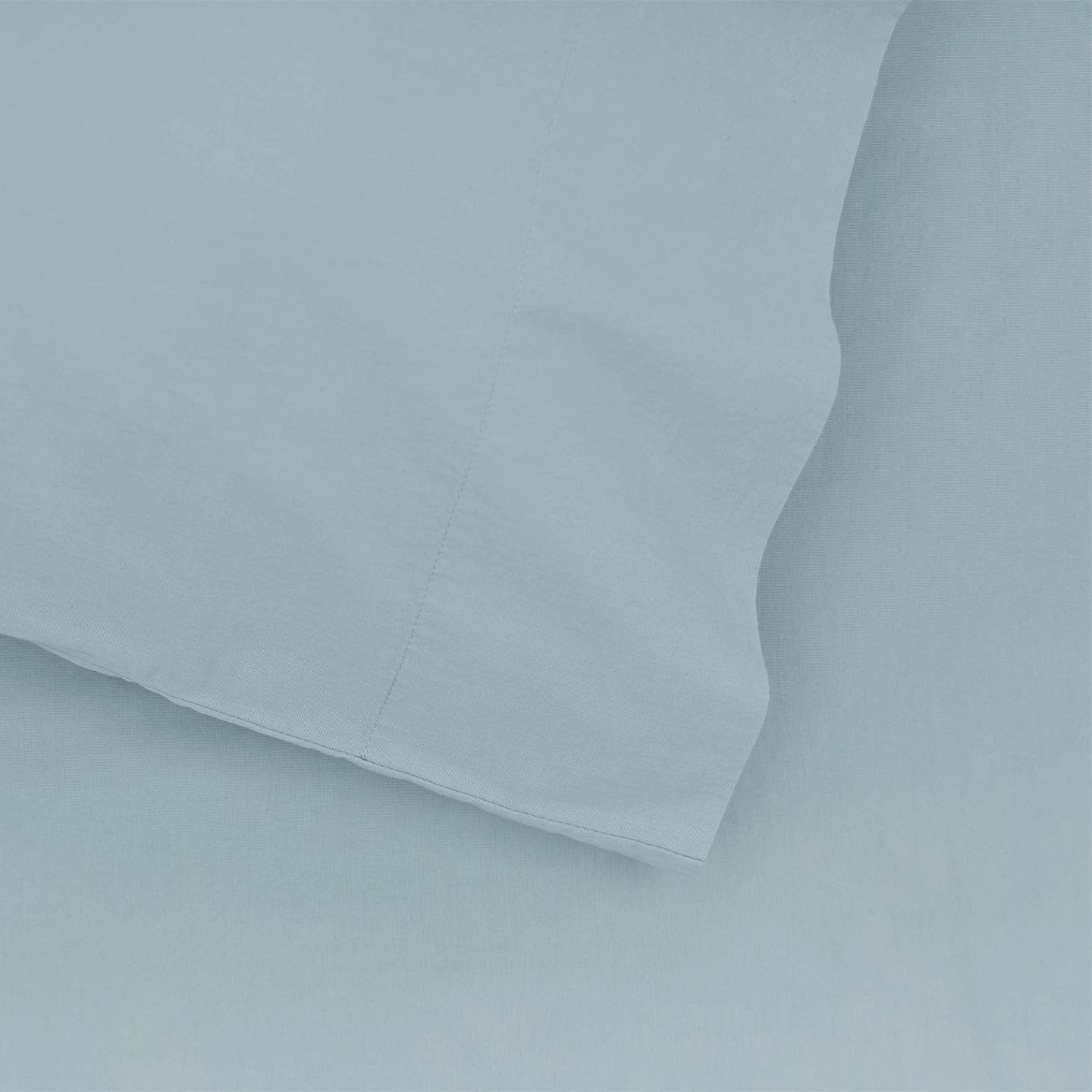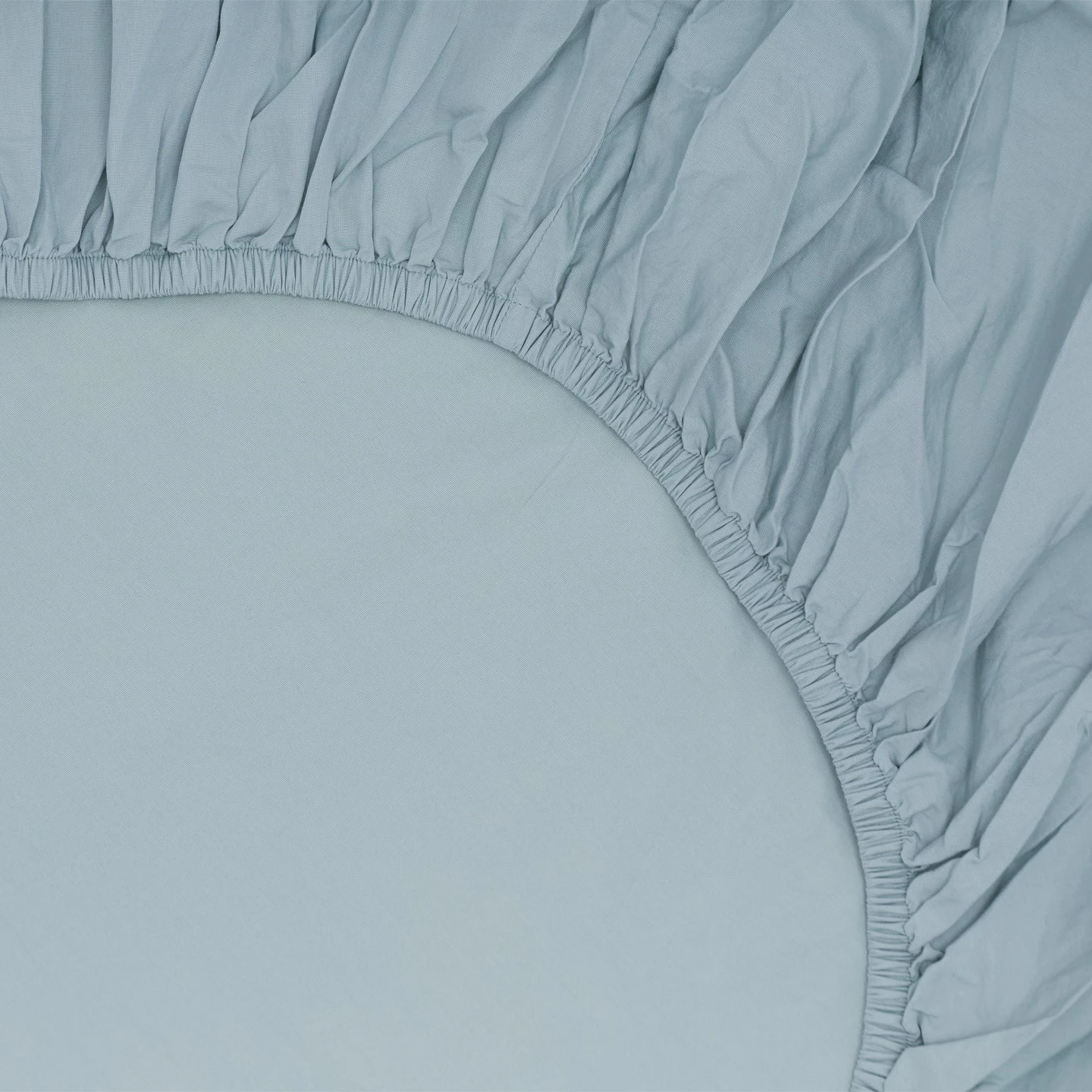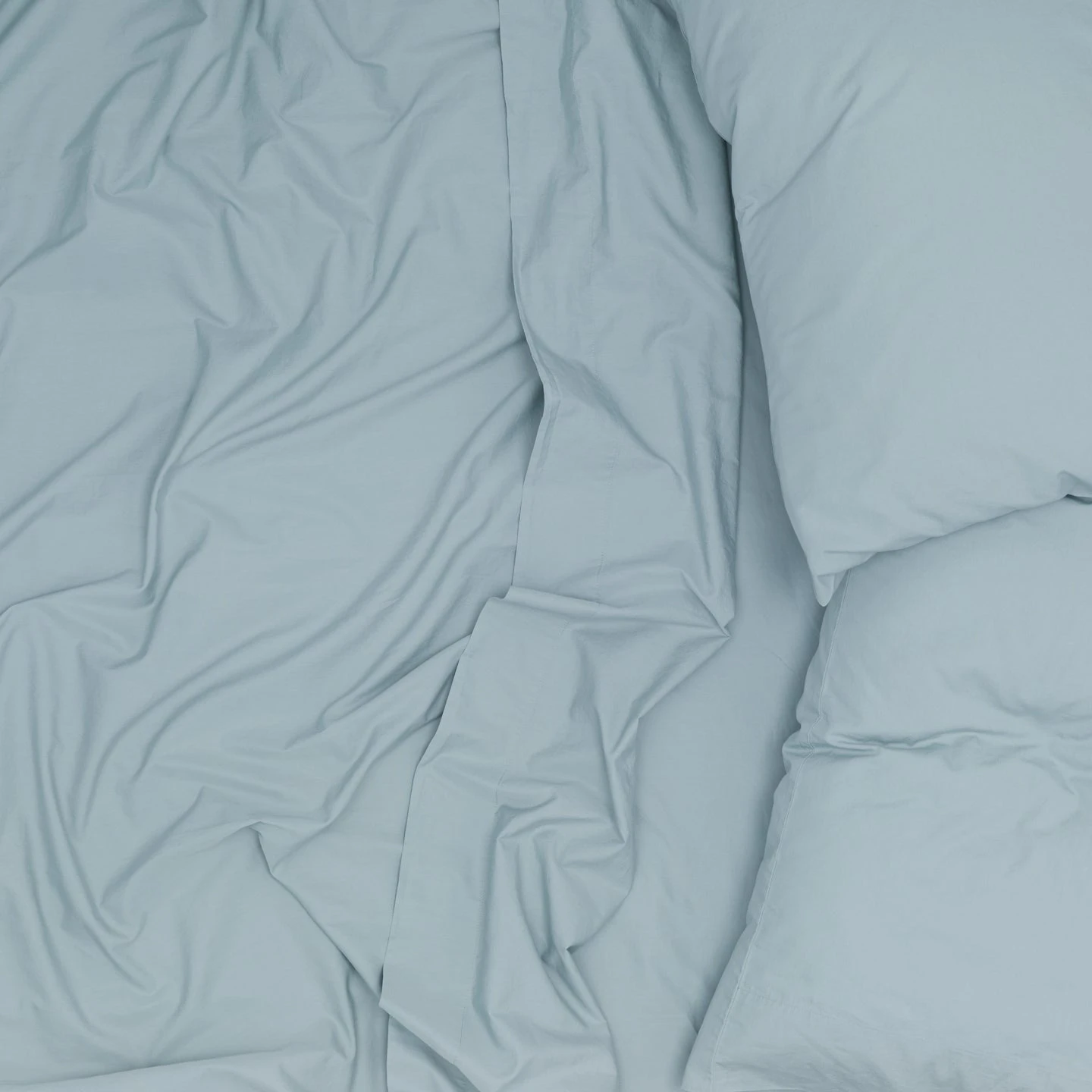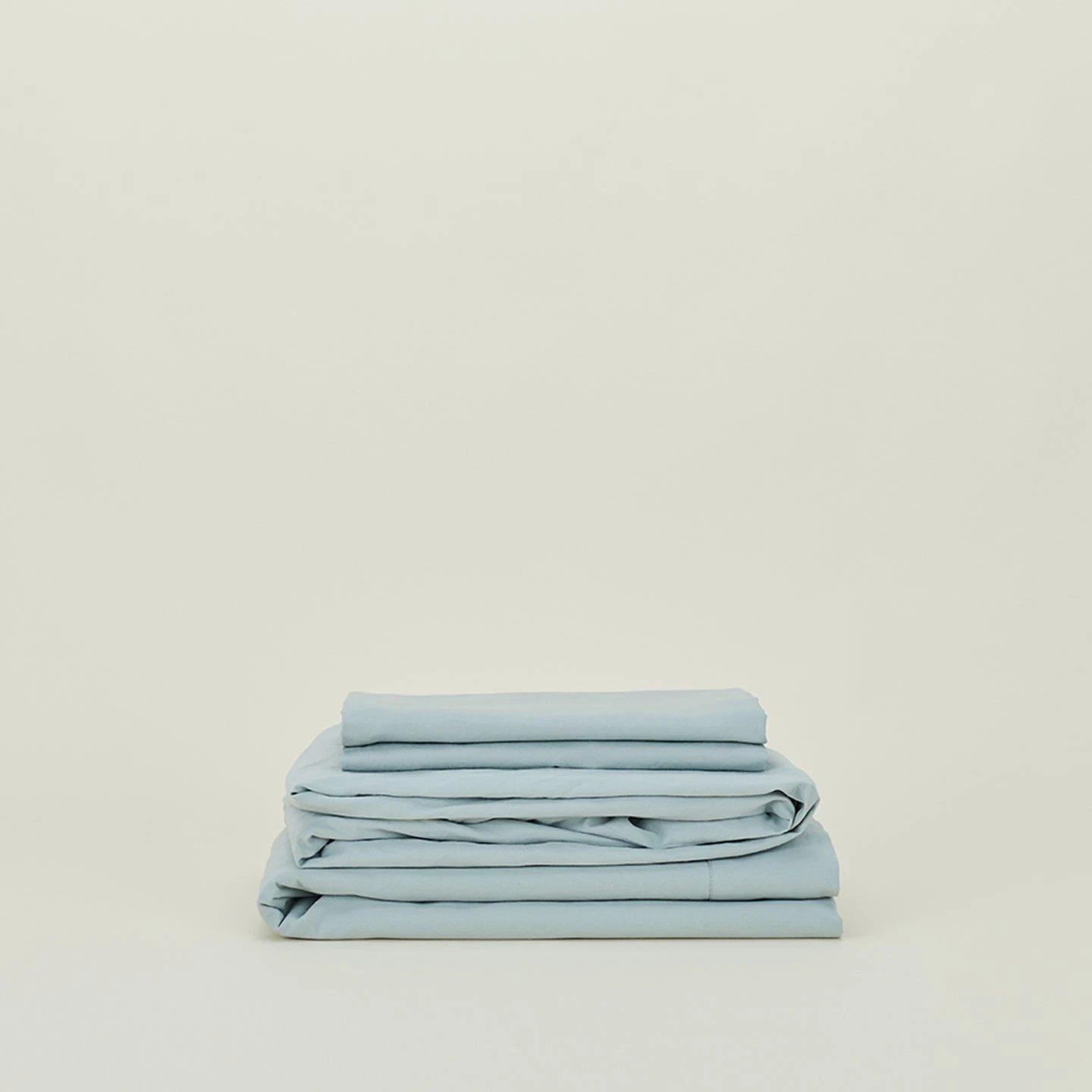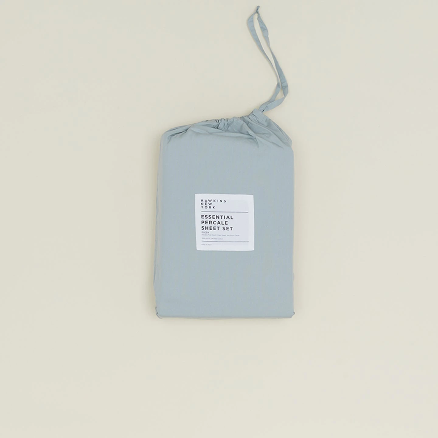 - A flat sheet, fitted sheet, + set of pillowcases in Hawkins percale